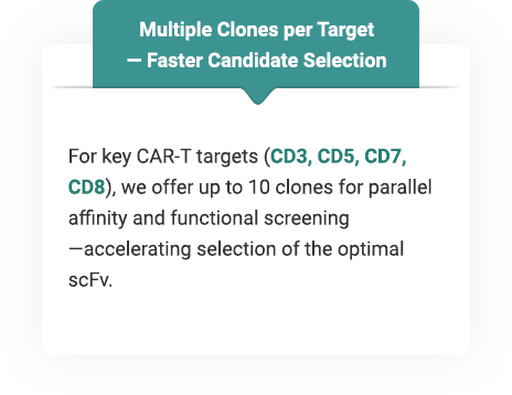 Powered by the SMabTM single-B-cell platform, Yurogen provides flow-validated, high-performance antibody sequences that can be rapidly engineered into targeted scFvs built for in vivo CAR-T success. Fast to screen, clean on IP, and ready for translation-so your program moves forward with confidence.